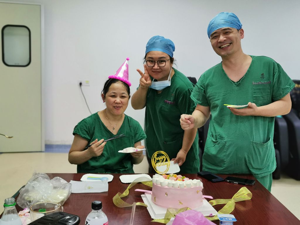 “我看见孙主任的健康码上的生日是今天,所以就订了一个蛋糕。”细心的麻醉科医生刘张玉发现了这个“秘密”。“我根本没有想到他们还会准备了生日蛋糕。”孙甫兰边说边笑,脸上的疲倦一扫而光。细心的人早已发现,原来孙甫兰穿的手术衣早已从里到外湿了个透。
