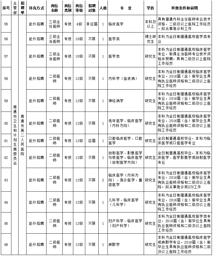 4.招聘岗位不设开考比例,无人报名的岗位取消该招聘岗位,取消岗位情况在南通市人力资源和社会保障局网站(www.jsnt.lss.gov.cn)和南通市卫生和计划生育委员会网站(//www.nthfpc.gov.cn/)公告。