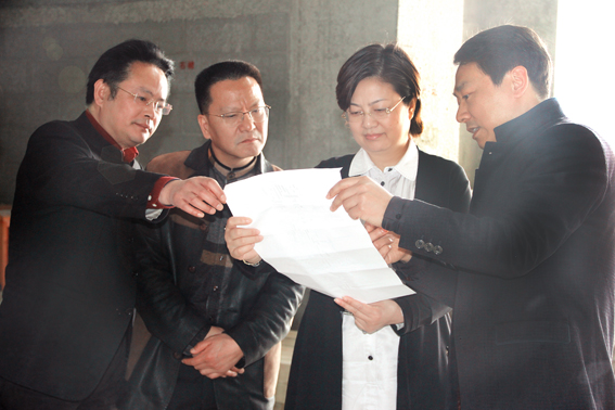 在二期项目门诊现场,任建兵书记拿出一幅文化浮雕背景设计图,向陈冬梅主任介绍其设计构想。他说,这张浮雕图反映了我院的历史变迁,大楼建成后将放置在门急诊病房综合大楼一楼中庭处,作为我院历史文化的重要展现。