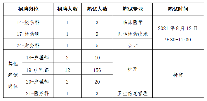 受疫情影响,本次招聘部分岗位笔试延迟。经8月6-8日查验行程码和苏康码,岗位编号21-医务科岗位参加笔试人员14天内均有中高风险区旅居史,笔试时间待定;岗位编号18、19、20为护理岗位,因报考人数较多,笔试时间待定;其他岗位所有报考人员14天内无中高风险区旅居史,笔试如期进行,具体安排如下: