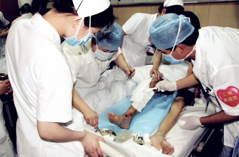 ,从四川绵竹接回了九名地震伤员。当时,因当地卫生条件限制,来通的大部分伤员都出现了不同程度的伤口感染,有的病程过长,需要二期伤口处理或手术,我院紧急调动了骨科、外科的所有医疗骨干参与救治,副院长、骨科主任陶巍栋带领专业救治组集中会诊、制定治疗方案,一天就成功开展四台手术,让伤员们得到了及时有效的治疗。