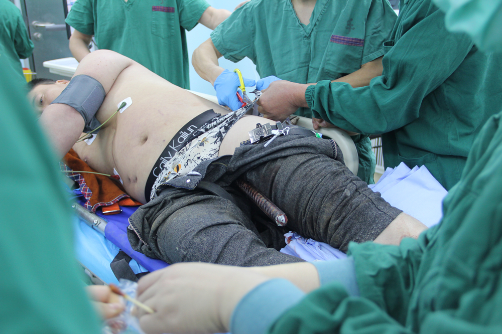 急诊医学科迅速启动创伤中心应急预案,开启急救绿色通道,对伤者进行急诊X光片、CT探查,发现有将近75厘米的钢筋穿入了腹腔。在这万分危急的情况下,创伤中心组织泌尿外科、ICU、普外科等专家紧急会诊,与时间赛跑,手术大抢救就此展开。因不能判定伤者内脏器官、泌尿系统等损伤情况,如何避免取出钢筋后造成伤者的二次损伤,是抢救要重点考虑的问题,更是考验急救医疗团队技术的难题。